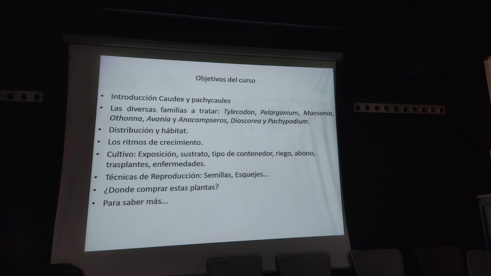 - Interesantísima charla sobre Caudex y sus cuidados, géneros, riegos, sustrato, abono… Fue una sesión muy instructiva con un ponente que alargó sus explicaciones bastante más de lo previsto aclarando todo tipo de cuestiones planteadas por los asistentes.